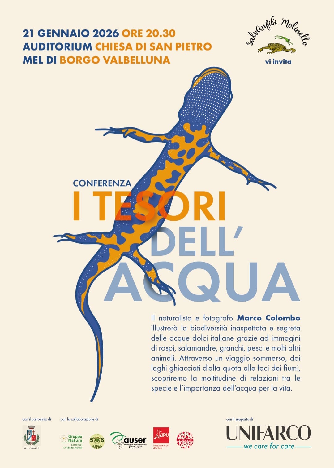 La serata è organizzata dal Gruppo Salvanfibi Molinello, grazie al supporto di Unifarco ed in collaborazione con il Gruppo Natura Lentiai, Auser il Narciso, SOS anfibi, Lipu Belluno, Meemu ed il comune di Borgo Valbelluna, organizza una serata divulgativa per sensibilizzare la popolazione sull'importanza della biodiversità, e portare informazione riguardo gli animali che popolano le acque dolci d'Italia. L'evento si terrà mercoledì 21 gennaio alle 20e30 all'Auditorium Chiesa di San Pietro.